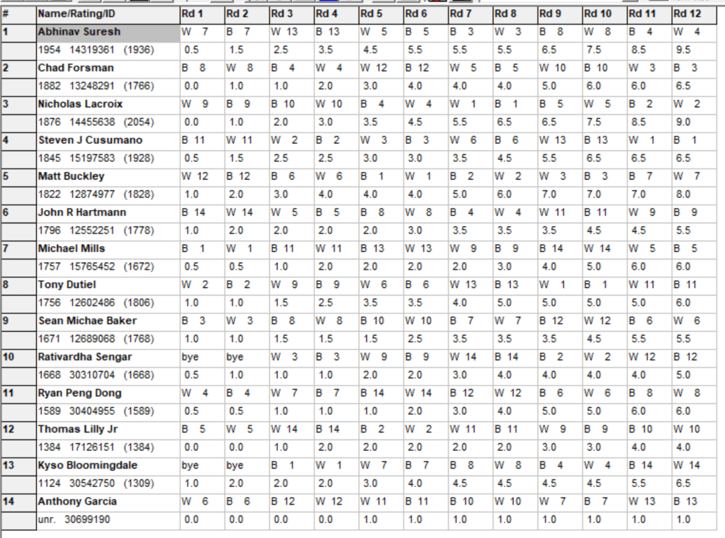 | 03 | 105. | xxx | Bloomingdale, Kyson Pat (1.0,1338) | xxx | Matuszeski, Matthew Dou (1.0,1302) |
